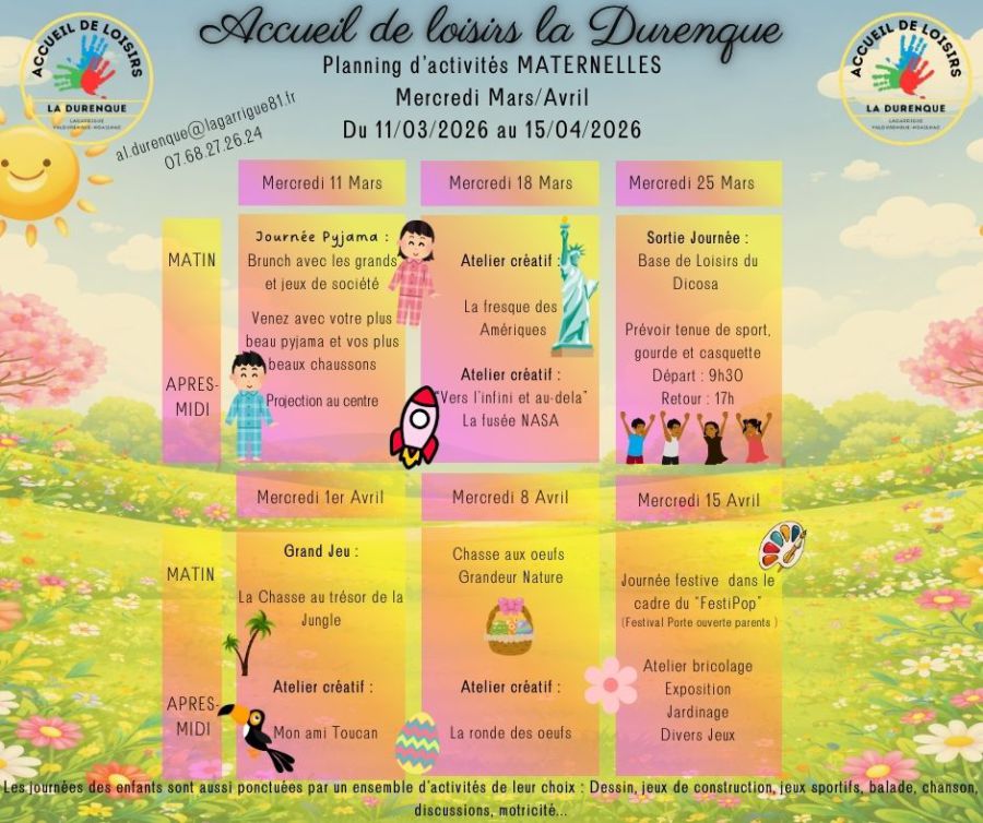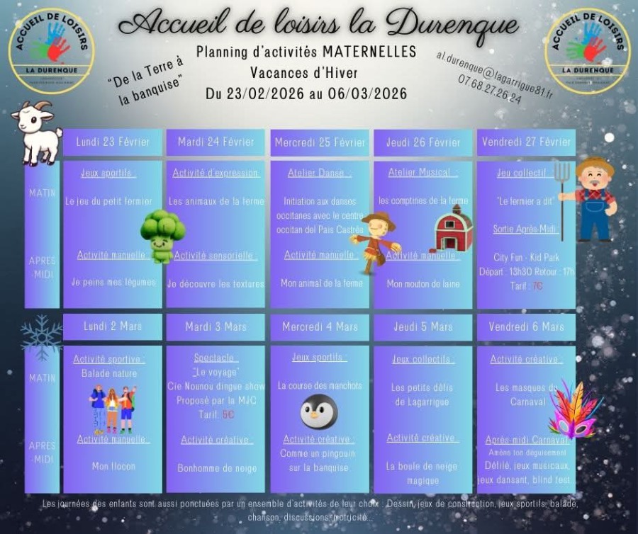 Possibilité d’accueil à la 1/2 journée (avec repas du midi) : pour les enfants inscrits pour la matinée entre 13h15 et 13h30 et pour les enfants inscrits pour l’après-midi : arrivée entre 12h00 et 12h15.