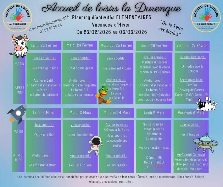Accueil ouvert aux enfants de Valdurenque et Noailhac voire de communes extérieures de 7h30 à 18h30 le mercredi pendant les semaines d’école et du lundi au vendredi pendant les vacances (sauf 1 semaine à Noël et 3 semaines en août).